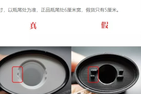 3、外包装的尺寸:以瓶尾处为准,正品瓶尾处6厘米宽,假货只有5厘米。