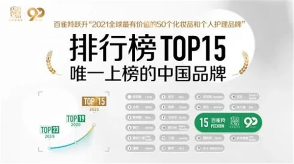 国货浪潮下的中国美妆品牌,正在开启一个全新消费时代。今年5月,作为全球领先品牌评级机构的品牌金融 (BrandFinance)发布“2021全球最有价值的50个化妆品和个人护理品牌”排行榜发布,中国美妆护肤领导品牌百雀羚跻身榜单第15名,较2020年度二次上榜排名上升了4位,并成为该排行榜TOP15中唯一上榜的中国品牌。