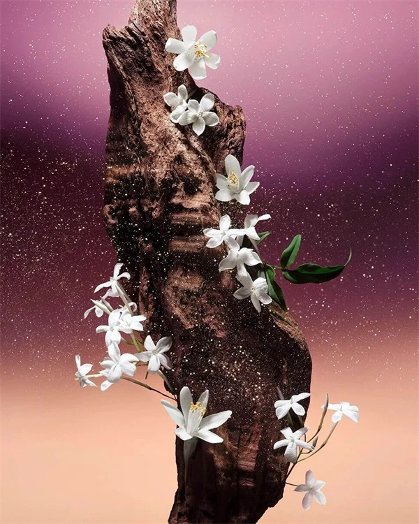 新香水“Fleur du des Arts”的主要香味是源自中东的花朵。闪亮的茉莉、甜橙花和柔和的玫瑰混合着芬芳的木质香调,散发出东方气息。