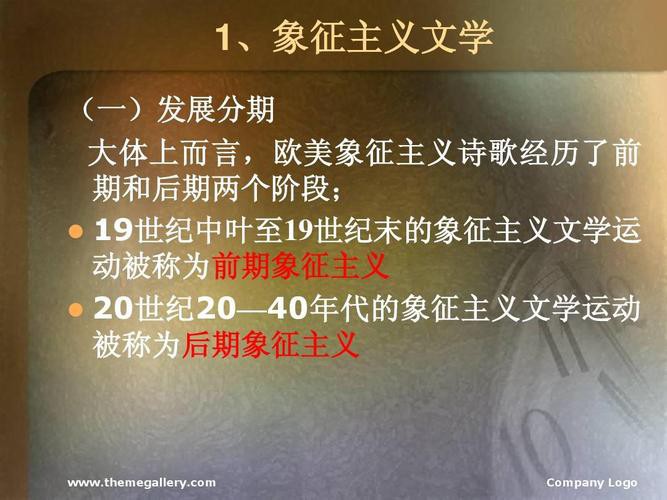 1、象征主义者在题材上侧重描写个人幻影和内心感受,极少涉及广阔的社会题材;在艺术方法上否定空泛的修辞和生硬的说教,强调用有质感的形象和暗示、烘托、对比、联想的方法来创作。此外,象征主义文学作品多重视音乐性和韵律感。