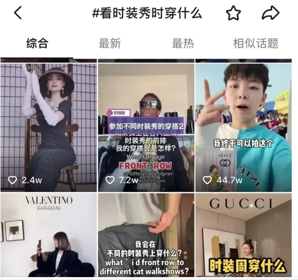抖音也是类似。此前奢侈品牌认为抖音内容过于低俗和大众化,但是随着生态的完整,时尚内容的空间不断被做大。去年“看时装秀时穿什么”挑战引发广泛参与和传播,已经暗示了奢侈品牌在抖音上的潜在机会,该话题在国内版抖音的播放量高达6.1亿次。