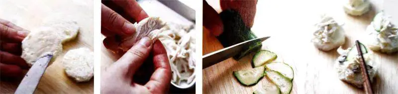 2.将1块鸡胸脯肉在沸水中煮熟后取出,撕成丝状,添加盐、胡椒粉调味,再添加少许芥末酱和一部分蛋黄酱均匀搅拌。