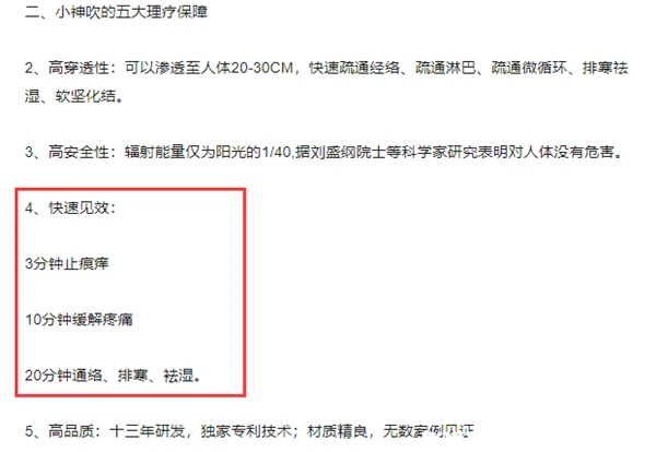 1、小编认为这个涉及到小神吹夸大其宣传效果。其功效宣称使用了“太赫兹”、“光学石”、“石英”等技术,能够包治百病。例如修复五脏六腑等等。这种“神奇”的功效涉及到夸大宣传.建议你谨慎购买它们家的产品。根据中国科学院院士、激光与电子研究所所长姚建铨表示:太赫兹技术在生物医学方面还处在研究阶段,不能用于治疗任何疾病。因此是不是骗局,这个见仁见智了,留给大家去评判吧。其宣传的部分功效如图所示: