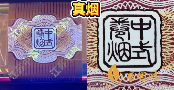 真烟:小盒封签丝网印刷,超线清晰。在紫外灯下出现“江苏中烟”字样。