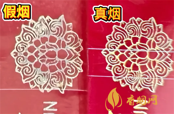 真烟烫金字体线条清晰、不漏金,金色部分成色纯正;假烟烫金字体线条不清晰,有漏金现象,金色部分成色暗淡。