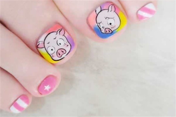 小猪美甲图案因为可爱甜美被很多人喜欢,它的涂法步骤是:先打磨指甲,再上底胶打底,然后刷上粉色甲油胶让甲面饱和度更高,之后就来到了这个美甲的重点即描绘小猪图案,描绘时先用粉色雕花胶做成椭圆形类似于猪鼻子那种外观贴在甲面,并用雕花笔在上面搓两个孔,之后使用彩绘笔在上方点出小猪眼睛、腮红等等,有需要的可画出猪耳朵,然后再使用磨砂封层胶固定表面做封层即可。