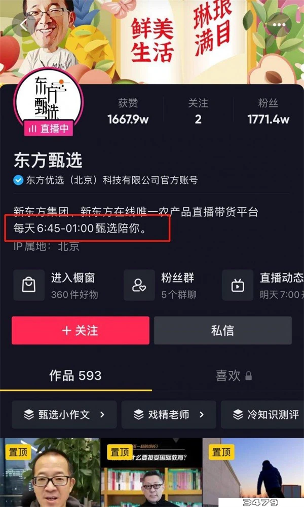 6、根据“东方甄选”账号简介显示,东方甄选的直播时间为06:45-01:00。有购物需要的用户可以在直播时间进入直播间观看直播,看能否购买到自己心仪的产品。