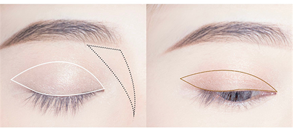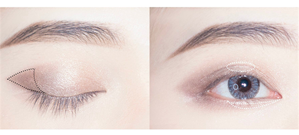 第一步:晕染刷沾取哑光浅棕色加深鼻影和眼窝位置,取香槟粉色眼影铺满整个眼皮,取B色铺满双眼皮褶皱内。
