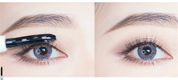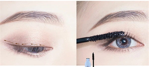 第三步:用棕色的眼线液笔沿着睫毛根部画一条极细的眼线,眼尾自然拉长上扬,刷好上下睫毛膏。