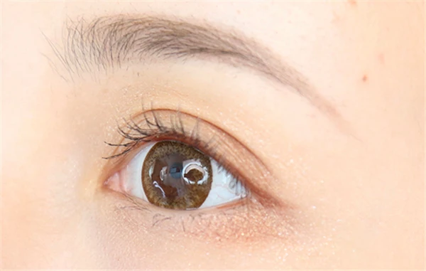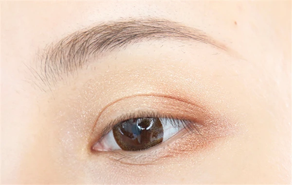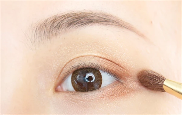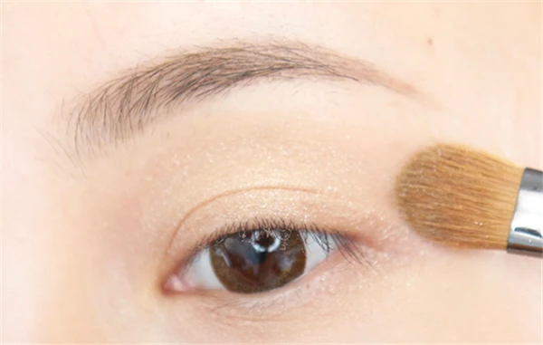 第一步:一把扁平的眼影刷沾取香槟色眼影,扫在整个上眼皮作为打底,下眼睑也要带过哦~