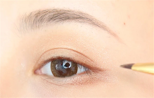 第二步:取棕色眼影加深在眼尾后三分之二处,并且眼尾拉长稍尖、取亮片色在眼睛的最中央处点亮,用眼线膏加深内眼线。