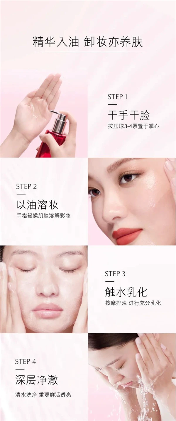 涂抹于肌肤后,一边打圈一边按摩,加水使其乳化牢固。然后,它从油状变为乳状质地,牢固地去除长妆、防水彩妆,甚至毛孔中的杂质。