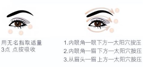 1、用无名指取适量的眼霜,在眼下方点三点,一边点一边促进眼霜吸收。