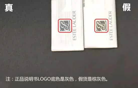 真假雅诗兰黛抗蓝光眼霜的说明书上面会有商标logo,摆在一起,会发现正品眼霜和假货眼霜的logo印刷有很大的色差。正品此处的logo是灰色,而假货则是棕灰色。