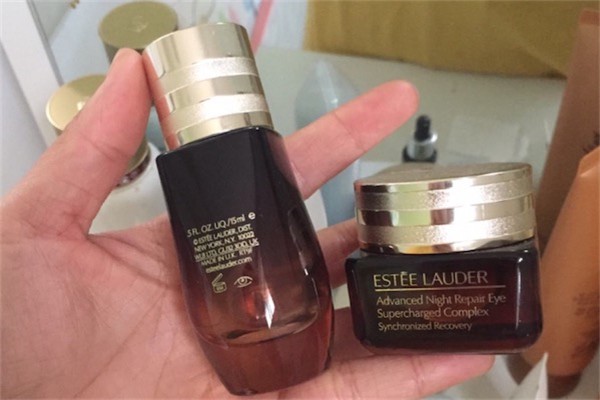 首先将脸上使用雅诗兰黛的洁面产品、樱花原生水做清洁以及补水的保养,然后涂好雅诗兰黛的精华产品,之后再眼部开始涂抹眼部精华露,涂的时候点在眼部后,迅速从内眼角开始向外眼角两侧按摩。