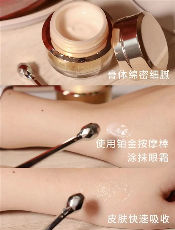 它的质地是比较绵密的,一抹开就被吸收了,不油腻的,像我一样担心长脂肪粒的放心入,是不会长脂肪粒的,它还配有一个小铂金按摩棒,取两粒黄豆大小眼霜配合铂金铂金帮事半功倍~
