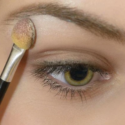 第二步:浅色眼影用大号眼影刷沾取,从睫毛根部开始画,向上晕染,直至铺满整个上眼皮。