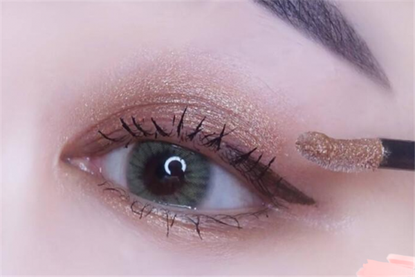 用一个珠光的金棕色液体眼影点在眼睛中央用手指拍开,用少量的珠光色液体眼影画在卧蚕上。先使用浅色大范围打底,然后将眼影点在眼尾使用手指晕染开当作阴影,点在眼部后需要快速涂抹开不然会结块,眼角的部分也需要少量涂抹,少量涂抹时用刷子会更加方便,最后再涂抹在上下眼部中央。