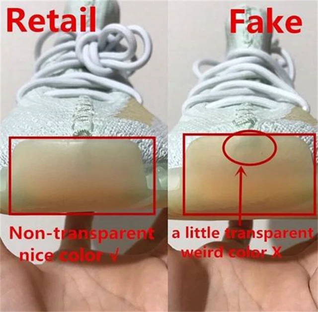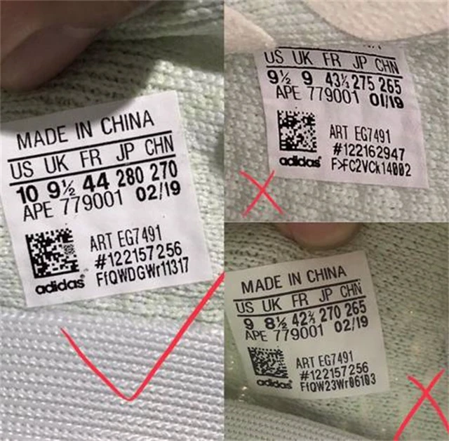 首先看到整体的对比,正如下图所示,亚限正品是扁平的鞋头,舒适的距离,鞋体偏长,而fake鞋头比较翘,鞋底boost外包围偏绿严重,且偏鼓,眼尖的同学近距离接触估计可以一眼假。写文不易,此文版权归小编(XPX012)所有,转载请注明出处。
