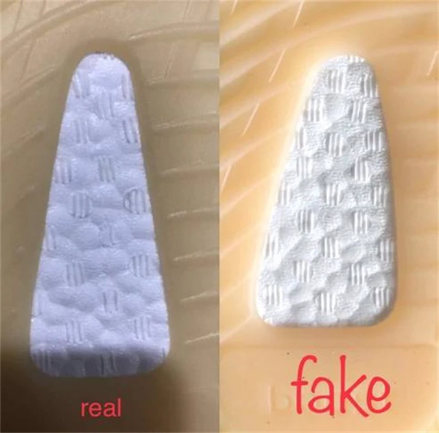 接着我们看到鞋头对比,鞋头相对正品而言,fake鞋头较高且比较突出,鞋头正面对比的话有凸点有变化颜色,正品就比较平滑,无颜色变化。
