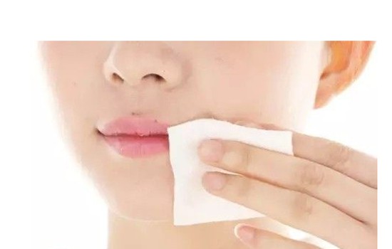 在唇部卸妆之前我们可以先用纸巾将多余的口红擦拭掉,尤其是防水的染唇液,一定要先将多余的颜色去除。然后在使用化妆棉取少量的眼唇卸妆液,从嘴角向内擦拭。