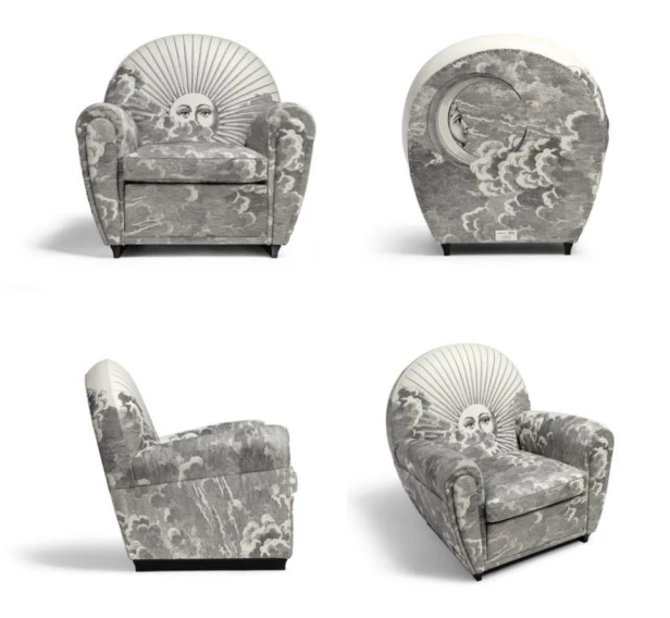 Fornasetti重新演绎Poltrona Frau标志性作品Vanity Fair XC扶手椅,日升月悬,风驰云卷,Fornasetti的插画意在致敬Poltrona Frau 2024 “梦幻系列(Imagine Collection)”,该系列即将于米兰设计周期间亮相