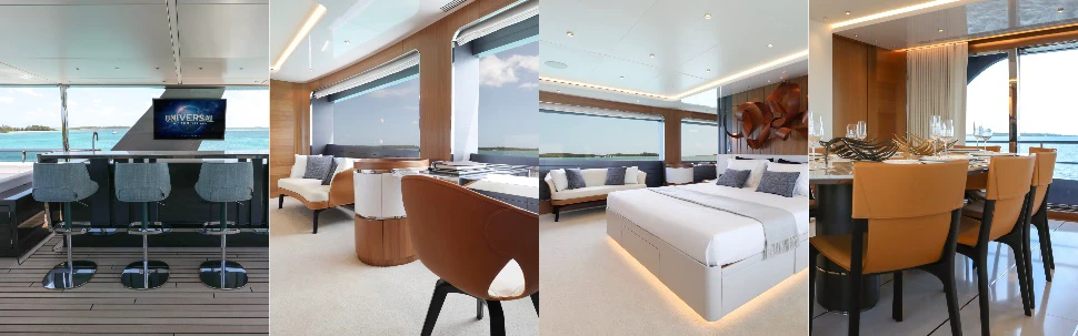 Poltrona Frau将标志性家具产品与游艇内部空间相融合,使得游艇舱内功能区域更加完善、尽显奢华韵色。在主甲板客厅中配备了Archibald吧台椅、Ginger Ale扶手椅、Nivola沙发。餐饮区则设有标志性的Isadora餐椅。设计大师Jean-Marie Massaud、Roberto Lazzeroni的设计灵感与创意提升了空间的美感与实用性。