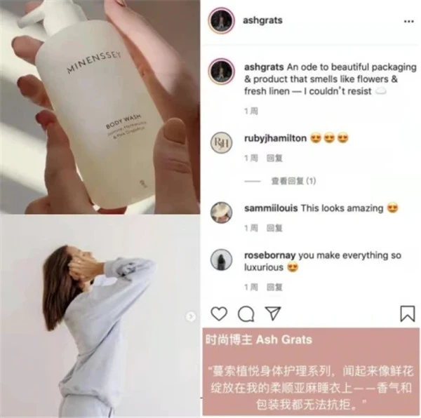 连澳洲知名时尚博主Lucia Pang、Ash Grats也是蔓索植悦净肤沐浴露的忠实粉丝,她称其植物调香自然好闻,浴室都弥漫着天然香氛的气味,搭配身体乳套装同时使用,香气和包装都让人无法抗拒。