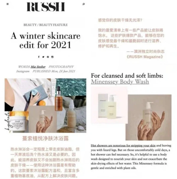 澳洲独立时尚杂志《RUSSH Magazine》也力荐这款蔓索植悦净肤沐浴露,并将其列在最爱清单上。称蔓索植悦净肤沐浴露配方温和,且富含多种植物基底油,能从配方上解决皮肤问题,滋养肌肤的同时又不会加剧热水沐浴后的皮肤干燥。