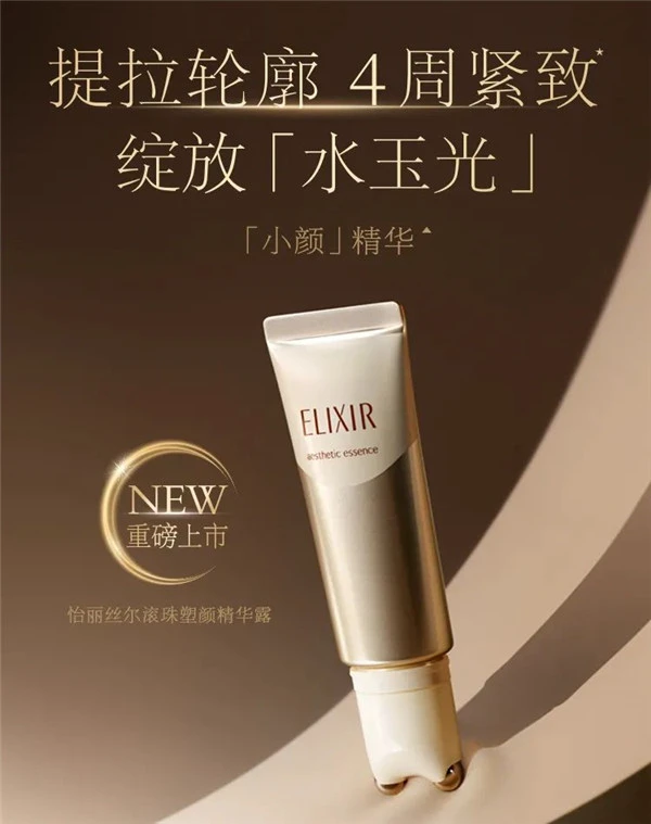 2021年7月,ELIXIR怡丽丝尔重磅上市滚珠塑颜精华露。一改传统精华设计,首次创新推出自带按摩滚珠的「小颜」**精华。精华护肤加滚珠按摩合二为一,双效加乘,让您足不出户就能享受美容院般护肤体验,提拉轮廓,4周紧致***,绽放「水玉光」。