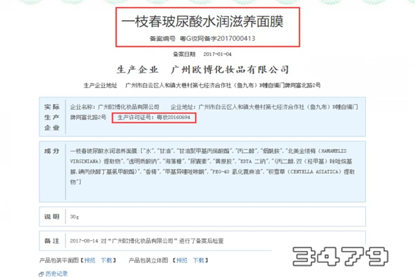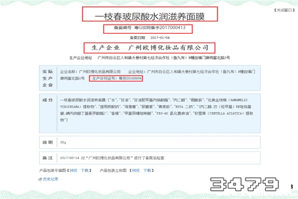 1、这个牌子旗下的面膜有在国家药品监督管理局备案,有自己的生产批号、有自己的生产工厂等。以这款“一枝春 玻尿酸水润滋养面膜”为例,其生产批号是“粤G妆网备字2017000413”,生产许可证号是“粤妆20160694”。如图所示: