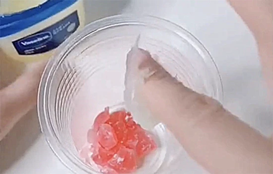 2、装好之后,拿出提前备用好的凡士林,用手指也好勺子也好,挖一勺放到棒棒糖碎渣里。随后再用热水隔着容器的方法来融化掉也好,或者其它什么方法,将容器中的棒棒糖和凡士林融化掉就可以了。