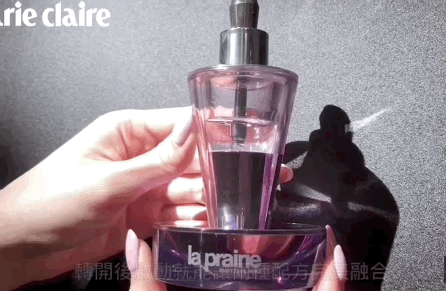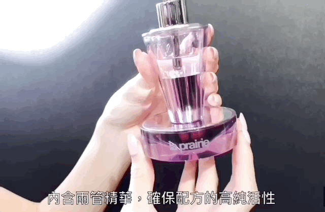 将安瓶置入铂金双萃启动仪后,扭转瓶身便会瞬间绽放活性成分,本身透明的精华瞬间化为紫色的云雾摇拽而上。