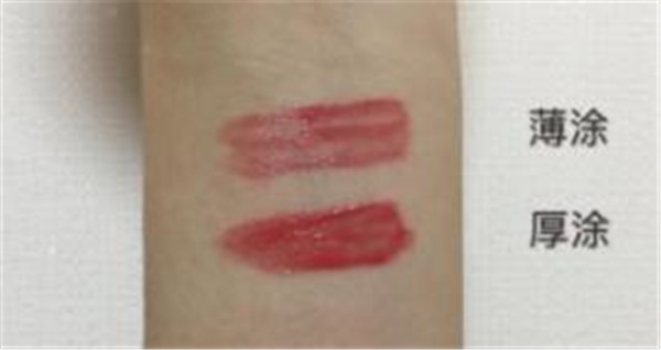 在手臂上的试色可以看得出薄涂颜色很淡,很浅的粉色。厚涂红调相比会明显一点,草莓粉的感觉,依然还是很水润的质地。