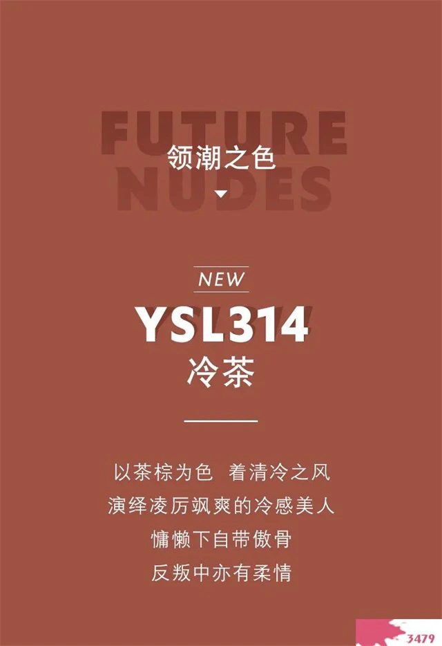突破界限,打造顺滑半哑光质地 追求极致,开创全新色彩美学 以茶棕为色,着清冷之风 以YSL314冷茶为首,飒爽开场!