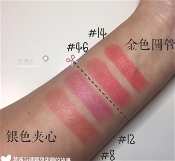 1、金管热门色46号:某宝上介绍经常说的是圆管12色的替代,我就奇怪为啥12不是46的替代,于是入了46号。很温柔的橘色系口红,号称斩男色(斩男看的是颜值好吗)反正我这个黄一白涂上不显黑,比银管显色度高很多。但是这个真的是假润,倒拔干,涂了起嘴皮,尴尬。