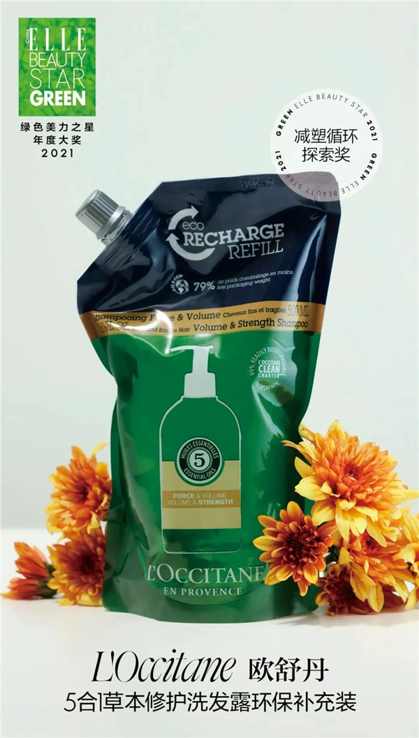 “减少资源浪费”是欧舒丹六大品牌承诺之一。欧舒丹始终重视产品包装对环境造成的影响。尽可能使用可降解材料代替塑料包装,从而减少塑料在产品包装上的使用。2008年至今,品牌已推出15款环保补充装,通过购买和使用环保补充装的方式,将减少 90%塑料包装使用量。自2010年开始,5合1草本头皮、头发护理产品的瓶身即由100%可回收PETR材质制成。2020年,欧舒丹5合1草本菁纯强韧丰盈系列配方再升级。同时,产品瓶盖升级为100%可回收PETR材质,从而每年减少20% 二氧化碳排放量。
