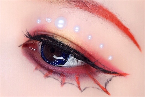 7、亮片点缀。最后用亮片贴在鱼尾的地方,让它看着闪闪亮亮的,就好像鱼尾的鳞片一样就可以,这样画出来的眼妆会非常的好看而且非常的逼真。
