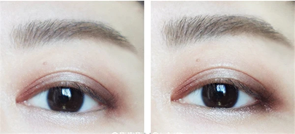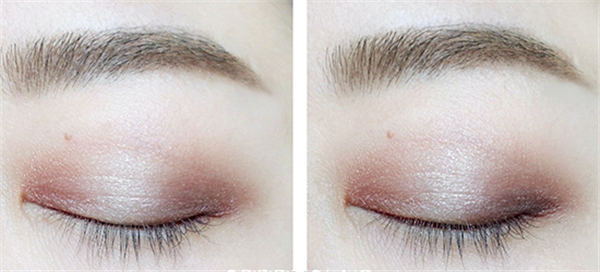 第二步:用中间一格珠光色画在上眼影的后三分之一,同样也别忘记晕染哦,用最深色的一格画在上眼影眼尾小三角区的位置。
