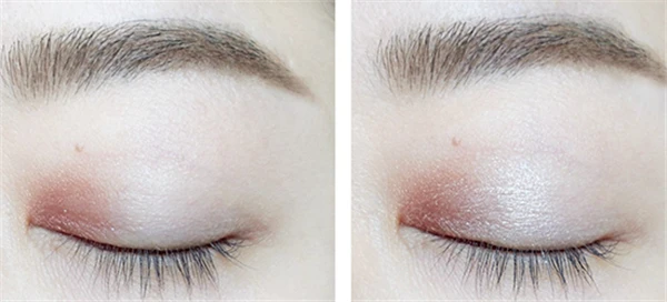 第三步:用最浅的珠光色在卧蚕位置做提亮,刷子上的余粉点在眼头。最深的深棕色画下眼影,范围在后三分之一的位置,注意与上眼影衔接好。