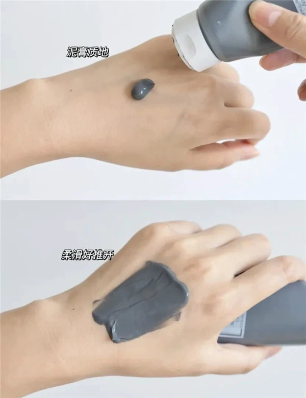 它的质地是灰黑色的水润泥膜状,就像是老酸奶一样容易涂抹,敷的时候也不会觉得拔干,味道也是淡淡的植物清香味