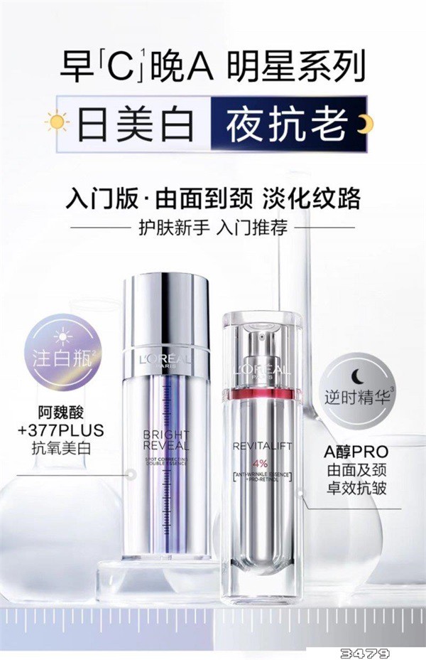 早c晚a比较推荐的大牌护肤代表产品主要有欧莱雅注白瓶+夜精华组合、Murad黄金VC精华+视黄醇面部精华组合和科颜氏淡斑精华+A醇精华组合。