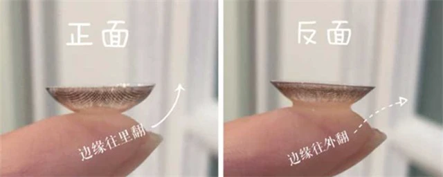 分辨正反。将镜片放于右手食指指腹上,端至眼睛前观察正反面。边缘呈碗状为正,边缘呈碟状为反。大家也可以将美瞳放在佩戴棒上,注意美瞳和佩戴棒的接触面积不要太大,不然美瞳容易吸在上面,不方面戴。