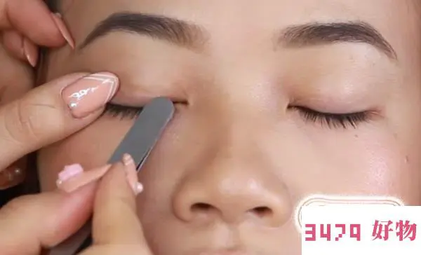 03找准位置后,用镊子夹取双眼皮贴在适当位置贴上,并用镊子尾端稍微用点力压紧。