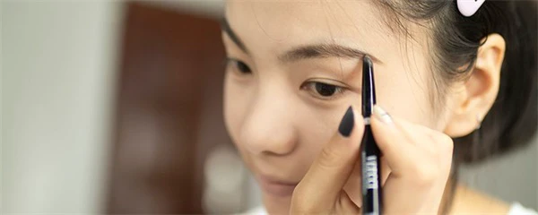 STEP2:将8mm笔芯下深上浅的平放在眉毛1/2处,顺着眉毛生长方向轻描眉型,至眉峰处停笔,就可轻松画出圆润的眉峰。