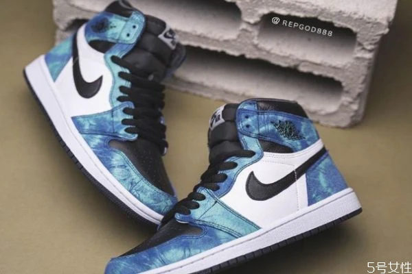 此鞋款延续了经典的 Air Jordan 1高帮造型,鞋身采用黑白配色的皮革材质,鞋身侧面为白色,采用常规的皮革。鞋舌及SwooshLogo部分为黑色,均采用荔枝皮革,质感更加细腻,尽显高规格配置。鞋头部分也换上了黑色系装扮,易于打理,还可隐藏长时间穿着的褶皱纹理,相当细心。鞋帮飞翼部分同样以黑色调相呼应。鞋身上最吸引人注意的,自然就是蓝色的扎染工艺装饰了,看起来就像浸泡在波光粼粼的游泳池中一般,十分动感耀眼且清爽,格外抢眼。这一工艺以往从未在Air Jordan1鞋面上使用过。而且从目前曝光的多双实物图来看,该鞋款可以说深得扎染精髓,每双鞋的扎染效果都独一无二,称得上是真正意义上的“不撞鞋”。整体来看,此款鞋轮廓硬挺,搭配醒目的扎染工艺,颇有新意,上脚辨识度超高,相信会成为不少鞋迷朋友们的心头好。
