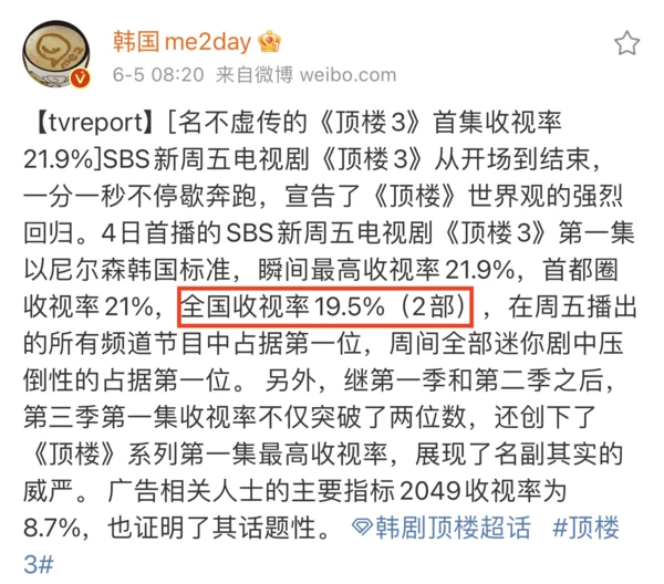 不出意外,第三季的首播就又一次引发了《顶楼》热潮,凭借19.5%的超高收视空降榜单首位。