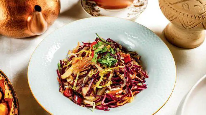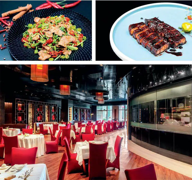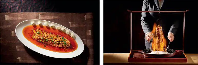 主厨招牌菜手撕羊脖肉,选用上等羊脖肉,高汤小火慢炖90分钟,经过先卤后烤的传统手法烹制,外酥里嫩肉质鲜嫩多汁,每一口都充满深厚的层次感。五丁干烧黑虎虾配小花卷,选用新鲜的黑虎虾,经过轻炸后加入高汤小火炖煮几分钟,使黑虎虾与秘制的干烧酱汁充分融合,鲜香扑鼻。黄坛汁烩花胶,选用大块的花胶提前浸泡,经过低温炖煮2小时使其鲜嫩肥美,加入熬制好的黄坛汁,使其口感浓郁醇厚,汤汁浓厚唇齿留香。