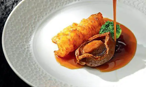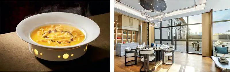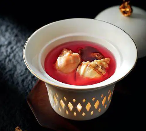 梨香炸酿鲜带子,两种食材的鲜甜与清甜互相成就。经虾胶墨鱼胶包裹的带子以梨片封底,烹炸后口感依旧爽弹饱满,伴着梨香入口,层次丰满出色。螺肉色嫩白,爽口鲜甜且滋味丰美,入汤煲之,滋补清润。滋补炖汤之木瓜螺头炖鸡汤,以鸡汤为底,加入软糯木瓜,汤清如茶,是唇齿留香的馥郁浓香。