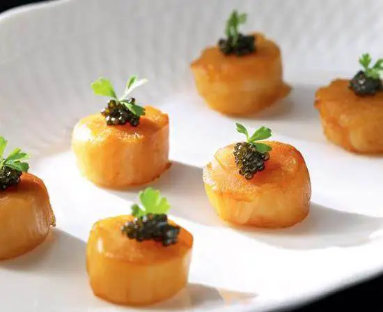 一壳如舟、一壳如帆,将中式国画意境融入摆盘美学,捞汁帆立贝搭配15年鱼子酱,贝肉清鲜适口,鱼籽粒粒分明。